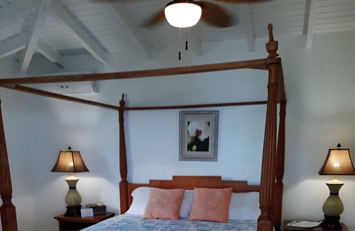 Just above Little Apple Bay. The open air design brings the uninterrupted view and breezes inside. An excellent value for those seeking upscale at moderate rates. Sugar Plum has two air conditioned king bedrooms, ensuite baths and full kitchen.