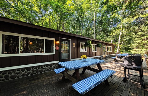 NATURE ELEVATED. ONE SEAMLESS STAY. ONE PRICE = EVERYTHING. NO SURPRISE FEES--JUST GOOD TIMES. | Black Bear Cave #3 is one of POV Lake Resort's cozy side-by-side 2-bdrm units. Great forest view. Lovely fireplace & big deck. 1st bdrm has queen; 2nd bdrm 2 sets bunk beds. Stunning Northwoods view & short walk to lake w/sandy beach. Hiking trails, kayaks, canoes, game room, general store & stargazing. Boat rental & romance packages available. Dogs allowed end Aug to early Jun - $50/pet per stay.