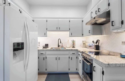 ᗌ BEDROOM 4: 1 KING BED (basement level) with private full bathroom, walk-in shower, fully equipped kitchenette, exterior door with private sun deck and wrap around porch connecting to pool deck