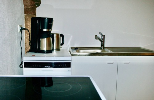 Apartment Ferienwohnung 5 in Neuried provides 60 sqm of space for 1 guest. You have 1 bedroom and 1 bathroom. A private well-equipped kitchen is available for your use. Amenities include WiFi suitable for video calls and a covered terrace. The apartment is situated in a fully renovated historic building that formerly housed horse stables. You enter through a double step at the entrance into the approximately 40 sqm living kitchen area. The living space features a seating area, TV, wardrobe, and dining table with an integrated kitchen. Solid wood floors and renovation adapted to the building's history create a cozy atmosphere with unique character.