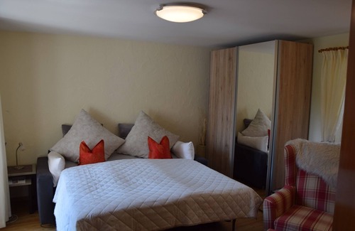 Die Ferienwohnung ist modern-gemütlich eingerichtet: komplette Küche mit Sitzecke, Wohnschlafzimmer, Sat-TV mit Teufel Soundanlage und WLAN, Dusche/WC, Balkon, eigenem Parkplatz, Liegewiese, Terrassenmitbenutzung.
