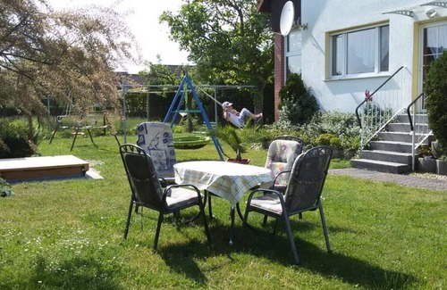 The apartment offers you a living room/bedroom with double bed and sofa bed, wardrobe, satellite TV (approx. 29 sqm), a children's room with 2 single beds, wardrobe (approx. 11 sqm), a fully equipped kitchen m. With oven, dishwasher, refrigerator, freezer, kettle, toaster, ... (approx. 12 sqm), a light lounge with 2 further sleeping facilities and TV, small book corner and seating area (approx. 15 sqm). Free WiFi everywhere. Our garden is very large and offers plenty of space to play for children. A barbecue m. Sufficient garden furniture and 4 bicycles with 2 child seats are available, your own skills are placed. 2 free parking spaces are on the property.