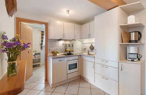 The apartment offers a large eat-in kitchen as well as a bedroom with double bed and bunk bed, bathroom and west-facing balcony. The kitchen is fully equipped, including a dishwasher, oven, freezer compartment and many electrical appliances.
