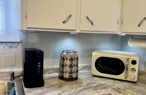 This space is a whole vibe! The unit includes a full stocked kitchen with updated appliances, breakfast nook with bar cart, and one bathroom. Bedroom boasts a comfortable queen mattress, mounted TV, and blackout curtains for privacy and comfort. The tandem room attached to the bedroom promotes an open work space, hanging egg chair perfect for selfies or meditating with space to do yoga! In the living room, the memory foam queen pull-out sofa is available for extra guests.