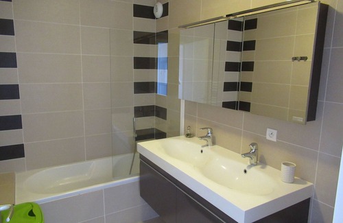 3-room apartment, 60 m2, 2nd floor. Living / dining room, flat screen TV. Bedroom # 1: 2 beds of 90 cm x 200 cm. Bedroom # 2: 1 bed 160 cm x 200 cm. Convertible sofa 160 cm x 200 cm. American kitchen (oven, dishwasher, 4-burner induction hob, oven, microwave, fridge, washing machine, hood). Shower + sink bedroom # 1, bathroom with bath, shower and WC, + 1 separate WC. Reversible air conditioning (bedrooms and living room). Terrace 45 m2 facing south. Terrace furniture available.