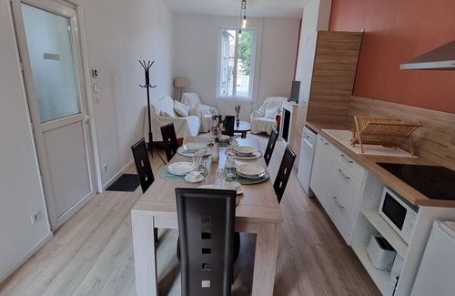 Appartement au calme composé au RDC d'une cuisine équipée (four, plaque, réfrigérateur, micro-ondes, cafetière, bouilloire) ouverte sur sur séjour canapés fauteuils et TV. a l'étage vous trouverez un couloir qui dessert 2 chambres: une première avec un lit 2 personnes et une seconde avec un lit 2 personnes et un lit 1 personne. une grande salle de bain WC avec baignoire et lavabo équipée d'une machine à laver.