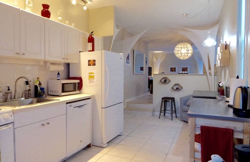 The apt. is full of interesting art and shapes, it is not just comfortable, but up lifting. it is a one bedrooms with king size bed, very comfortable mattresses, soft linens, closets and work table. The layout of the apt is open, flowing from kitchen to dinning area to living room.There is one full bathroom. The kitchen has anything you might need, a dishwasher, fridge, stainless steal workspace, microwave, stove, coffeemakers, toaster, mixer, dishes, cookware a small amount of food, oil... Please enjoy the beautiful new salt water pool with spa, the seating areas in the large garden, the lounge chairs and the beauty of the flowering trees and plants. It smells heavenly. It is shared with the other 2 short term apt in the building. The living room has 2 sofas, smart TV and WIFI. Please use your own streaming app I provide Netflix . There is a washer and dryer in one of the closets.The building is blue and orange, it has 3 apt.