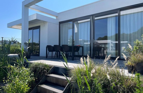 This lovely villa in Flevoland is located by the water and has a jetty. The children can jump from the jetty into the water and after a walk through the woods, you can relax on the terrace. This modern accommodation is very suitable for holidays with the family. The wonderful location by the water is one of the highlights of this house. The connection to the open water will probably be realised in 2023. In Harderwijk and Ermelo you will find cosy restaurants, nice shops and several supermarkets. The enthusiast can play golf at the adjacent golf course of Harderwijk Golf & Events, and a day at Walibi is also possible. Relax in the attractively furnished garden or prepare a meal of your choice in the well-equipped open kitchen. The living room is furnished with a TV, a sitting area and a 3-metre long table for joint dining. There is a barbecue for pleasant summer evenings and you can park your car in the parking area. Note: Brasserie and golf course is part of the park.