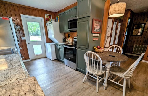 If you don't require the finest amenities, luxury appliances, and marble countertops but prefer cozy, comfortable accommodations in a beautiful rustic cabin overlooking a 3 acre pond with privacy, then you've found the perfect rental. Our cabin has 2 bedrooms, 1 bathroom, a kitchen, living room with a stacked stone wood burning fireplace. Cabin has plenty of hot water with a washer and dryer and a dishwasher! Queen bed and two sets of bunk beds comfortably sleep six people. Our cabin sits on 65 acres off HWY 14 and is 7 miles from the Auburn University campus. ABSOLUTELY NOT recommended for those who don't like nature, dogs, cats, ducks, dirt and wildlife. IDEAL rental for those wanting to experience the energy of Auburn but retreat to a simple private getaway! No frills out here. Only nature, quiet, and beauty. 1.5 miles from our driveway to the Dollar General and Gas Station on Highway 14.
