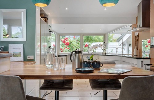 Just 150 meters from the beach you will find this modern and inviting vacation home with great facilities. Bright and open living spaces await you, which will quickly become your meeting place on vacation. Enjoy time together in front of the fireplace, play cards or read a good book. The TV room is perfect for great movie nights. Just choose a movie and your favorite snacks and get comfortable. Vacation meals are taken at the set table, and if the weather is nice, you can also go out on the terrace. Start your day with a steaming cup of coffee and plan your trips and activities while the kids play in the garden. Later, you can enjoy the balmy summer evening with a delicious barbecue. For children and the young at heart, there is an activity room where you can compete in table soccer and table tennis, among other activities. After an active day, it's nice to take a bubble bath and recharge your batteries.