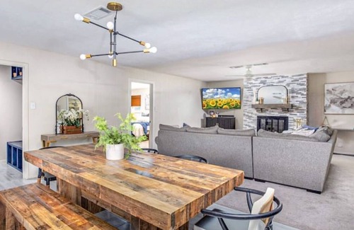 This ranch-style home is the perfect retreat for groups looking to escape the city life. With 4 spacious bedrooms & 3 bathrooms, there's plenty of space for everyone to unwind. The property is situated on a large lot surrounded by mature trees, providing plenty of privacy. Located near the lake, this home is perfect for boating, fishing & enjoying the scenic views. The quiet neighborhood is the ideal place to recharge & enjoy some peace & quiet. Book your stay today & experience the tranquility!
