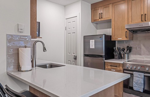The unit is quiet with no one above you and has nice views from every window. The open concept spacious kitchen-dining-living area features in floor heating, a gas fireplace, a modern kitchen, stylish lamps and comfortable furniture. Guests can use the clubhouse with laundry facilities, oversized hot tub, BBQ area and fire pit.