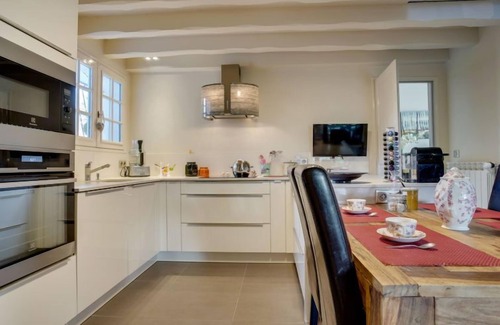 3-room house 115 m2 on 2 levels. Renovated in 2014, very practical and beautiful furnishings: open living/dining room with TV and international TV channels (flat screen), heating stove and electric shutters. Exit to the terrace. 1 room with 1 french bed (140 cm, length 190 cm), TV (flat screen), electric shutters. 1 large room with Dressing room with 1 double bed (2 x 80 cm, length 200 cm), hand-basin, shower/WC and TV (flat screen). Exit to the terrace. Open kitchen 15 m2 (oven, dishwasher, 4 induction hot plates, toaster, kettle, microwave, freezer, electric coffee machine, Capsules for coffee machine (Moulinex) extra). Bath/shower, sep. WC, double hand-basin. Upper floor: 1 open room with sloping ceilings with 1 sofabed (140 cm, length 190 cm). Wooden floors. Terrace 20 m2, south facing position and, east facing position. Terrace furniture, barbecue. Facilities: washing machine, dryer, children's high chair, baby cot. Internet (WiFi, free). Please note: non-smokers only. Maximum 1 pet/ dog allowed. Smoke alarm. FR59800
