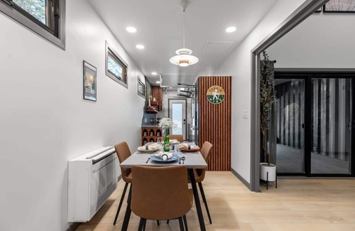 The Base Camper Inn is more than just a cabin; it's an experience, a place to reconnect, rediscover yourself, and create memories that will last a lifetime. Enjoy this unique space built from shipping containers and featuring a spiral slide, swings, rooftop deck, and more! You will be met with modern luxury through this custom design in the fully functional kitchen, near the Solo Stove accompanied with beautiful views, or relaxing in the hot tub after a long day. Base Camper Inn has it all!