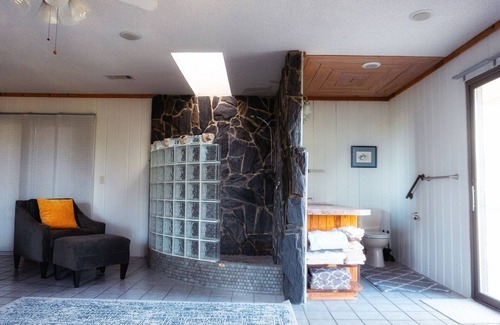 The romantic master bedroom is a unique open concept with a custom stone and glass shower. Shiplap accent walls, with a lounging sofa, comfy chair with ottoman from where you can watch TV. The master bedroom opens up to one of the new beautiful decks complete with an outside hot shower! The 2nd bedroom features two twin beds, and a double dresser with an adjoining bath room.