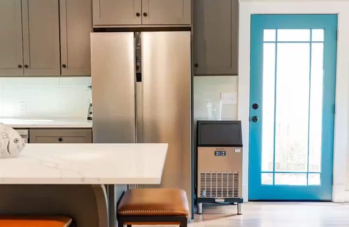 Fully stocked kitchen with stainless steel appliances and an ice maker.