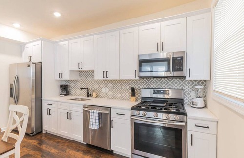 • Kitchen space with white shaker counter tops and stainless steel appliances