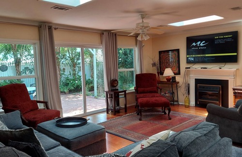 SPACIOUS HOME IN OLD OCEAN SPRINGS , PRIVATE COURT YARD , CAR PORT , SMART T.V. IN LIVING ROOM WITH CABLE AND PREMIUM WI FI , COMFORTABLE FURNISHINGS , KEYLESS ENTERY , SUN ROOM OFF OF MAIN BED ROOM ( KING BD & WALK IN SHOWER ) , BD W/ QUEEN , BED W/ 2 TWIN , NEWER HVAC , SMART T.V. IN EACH BED ROOM. OFFICE DESK, CHAIR, PRINTER AND SHREDDER.