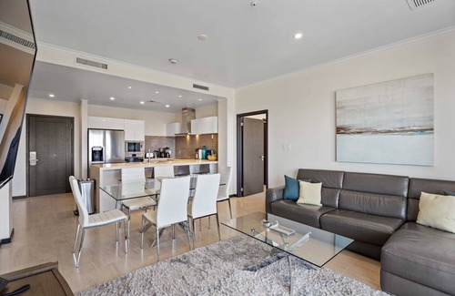 The primary bedroom has a king-size bed, a TV, and access to the balcony with stunning views. The primary bedroom offers a full modern en-suite bathroom with a shower and walk-in closet. The second bedroom has a queen-size bed, a TV, built-in closets, and access to the balcony with stunning views. The second modern bathroom is just off the second bedroom with a shower.