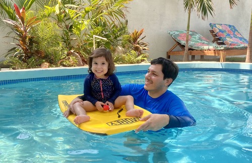 Yes, this Beachfront Private Apartment has a swimming pool. Check the Facility Overview section for details about the pool and other available facilities.