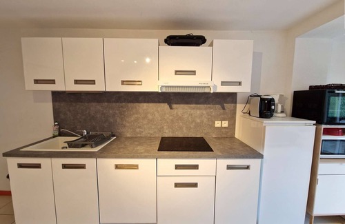 Open kitchen with fridge with large freezer, microwave, ceramic hob, dishwasher, electric coffee maker.