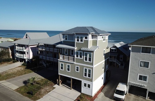 This 4 bedroom house is equipped with an ELEVATOR!! You won't find that in most beach rentals - no struggling with your luggage and groceries. A private master suite occupies the top floor. It has a beautiful ocean view, KING SIZE BED, large bathroom, luxurious shower, and a comfortable chair by the window to read or nap. Two more bedrooms also have KING SIZE BEDS!!! The fourth bedroom sleeps as many as 5. All bedrooms have flat screen TV's. We request only Saturday to Saturday rental periods until after mid August. Remember, THREE out of four bedrooms have KING SIZE BEDS. Fourth bedroom with multiple nice bunk beds (see pics). The house features six flat screen TVs with cable (including HBO) and high-speed wireless internet service. Three bedrooms are on the first floor. One has a private bath and one has a private balcony. There is one additional bathroom on the first floor, with a beautiful tile shower. All bedrooms have hardwood floors and nine foot ceilings. The elevator provides service to all floors, so no need to climb stairs with your suitcases. The house and all furnishings are absolutely new as of June 2018. Flat screen televisions are in all bedrooms, the living room, and even the kitchen (SMART TV's). The second floor has a 10 foot ceiling and open floor plan with ocean view. Large, fully furnished, beautiful kitchen with granite countertops and a huge island. A great front porch provides westward views of the waterway and sunsets. There is a sleeper sofa in the living room if an additional bed is needed. This sleeper has a special mattress that is far more comfortable than a typical old-fashion terrible sleeper sofa mattress. A nice laundry room features a new washer and dryer, along with lots of storage space. Plenty of parking available for up to six cars. A nice outdoor shower (with hot water) is located on the ground floor. The private walkway to the beach extends directly from the parking pad to the beach sand. A large storage cabinet on the parking level is outfitted with beach chairs for your use.