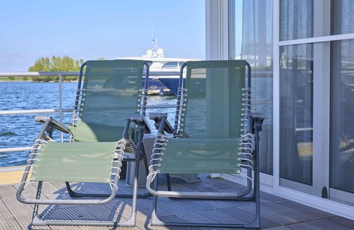 This stunning houseboat is very luxuriously furnished and fully equipped. It is located on a beautiful mooring in Kerkdriel harbour. When the weather is nice, you can enjoy the lovely sunshine outside on the roof terrace. Wake up with a cup of coffee and listen to the waterbirds and all the boats sailing in and out of the harbour. But even when the weather is less clement, you can relax on the sofa and enjoy the beautiful view. This is never boring