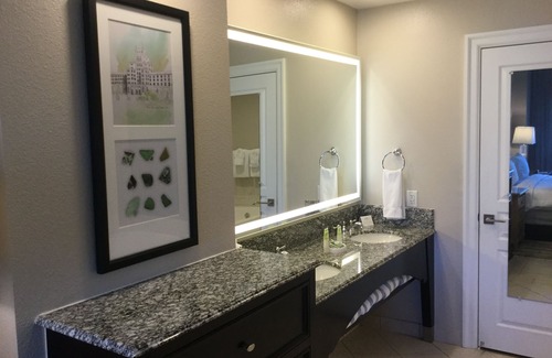 This is a spacious two-bedroom deluxe suite (non-smoking) with wi-fi wireless broadband, features a master bedroom with a king bed with a private bathroom and the 2nd bedroom has two queen beds and a separate full bath/bathroom.