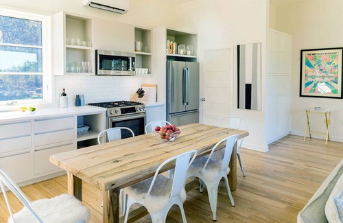 Architects Charles Rose and Maryann Thompson designed this one-story vacation home like a camp. It's comprised of three separate buildings with pathways between them. Building one is a beautiful primary bedroom and bath with a walk-in closet. Building two includes a combined living/dining room, kitchen, and half bath with a wall of sliding glass doors. Building three has two bedrooms, a full bath, and a beautiful outdoor shower attached.