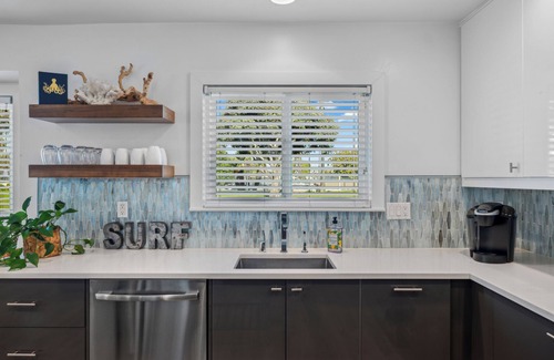 The kitchen is really nice, spacious and open. There is a lot of room in the kitchen cabinets to store your food. We provide all of the basics cooking equipment so you can easily make the family a meal after a fun day at the beach. Gas range and oven, microwave, big refrigerator, Keurig coffee maker, blender, rice cooker, toaster, etc.. We provide some of the basics (salt & pepper, oil, sugar, etc..)