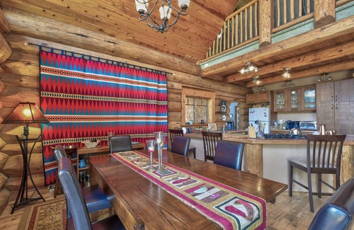 This luxury log home is made of hand crafted logs, large picture view windows, comfortable high end bedding and furnishings. The home is 3500 square feet on 2 levels. The six acre property has beaver ponds and a year-round creek. There is plenty of parking. The home has a wrap-around deck with outdoor dining and BBQ facilities. The 3 bedrooms are furnished with king size beds but extra twin beds can be added to 2 of the bedrooms for extra guests. We recently added an 850 square foot suite on the first florr of the property that adds 1 king bed and 1 twin bed , an additional full bath, sectional count and coffee service. This makes the house nearly 4100 square feet. This additional suite is $50 per night or is automatically added and charged the same amount when you have 8-10 guests. The property is completely organic and has never had harmful chemicals applied. The logs are not stained on the inside but polished with organic oils.