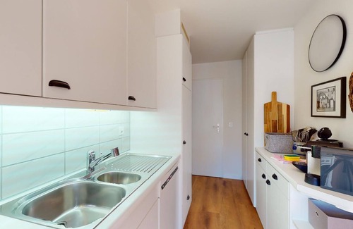 Beautiful, stylishly furnished 2-room flat on the 2nd floor with gallery, 60 m2, in a quiet and central location. Living/dining room with exit to the balcony. Mountain view. Internet and TV. Open kitchen with dishwasher and oven. Coffee machine Nespresso. Bathroom with shower/WC/sink. Double room with boxspring bed. Loft with double bed (2 mattresses) under sloping roof, very steep stairs. New, comfortable furniture. Garage place. Laundry and ski room for shared use. Non-smoking flat. Pets are not allowed.