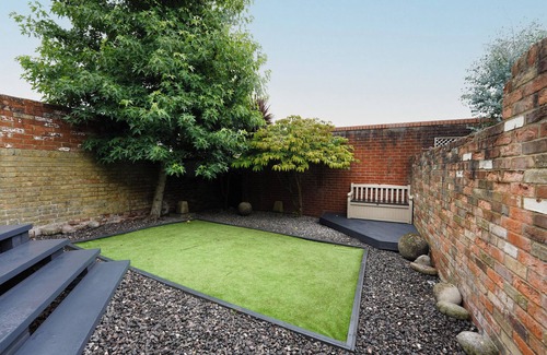 This fully enclosed space features a beautiful red brick feature wall, creating a sense of privacy and exclusivity. Relax on the large decked area surrounded by planted beds bursting with an array of verdant plants. A dining table and chairs for six guests provide the ideal setting for al fresco meals, while a huge parasol offers shade on sunny days.
