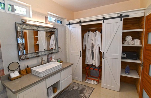 Beyond the double doors of this upstairs luxury air-conditioned King bedroom are unobstructed views of the Caribbean Sea and the entire Beyond the Sea property. Equipped with a fan in the high vaulted ceiling, a large ensuite bathroom, a walk-in shower, and an individually climate-controlled unit, guests are transported to a tranquil and modern experience. Enjoy thoughtful amenities including a hair dryer, safe, flat-screen Smart TV, work desk with multiple outlets, Keurig machine, mini microwave, minifridge, and more—max occupancy of 2 guests.