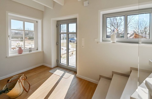 The exclusive holiday home Bi de Bark has been completely renovated and, like all accommodations in the holiday complex, built to the standards of a new building. With two large bedrooms, each with a box-spring bed (180x200) and a single bed (90x200), as well as two bathrooms, it offers space for 6 to 8 people on two levels. Bi de Bark is bright, modern, and at the same time classically elegant, furnished with great attention to detail. The open living area impresses with a large dining table and a comfortable living area with a sofa bed (quickly extendable with slatted frame and mattress 140x200). With two terraces and a gallery featuring a modern glass sauna on the upper floor, the holiday home offers plenty of space for individual relaxation. The fully equipped kitchen is integrated into the open living area and leaves nothing to be desired. Underfloor heating, combined with solid masonry and large mullioned windows, ensures a pleasant and ecological indoor climate. The beds are made upon your arrival, and towels (initial supply) are provided. This service, as well as all additional costs, are included in the price.