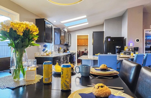 Walking through the front door, you’ll enter the open concept living, dining, and kitchen area with a view of the large backyard. This common space is where families and groups can enjoy each other while getting ready to start their day or winding down from one. In the living room, there are 2 comfortable leather couches, 55” Roku TV, couple of board games to pass the time and a Visitor's book. Leave us a note, we love reading about your adventures. Dining area has a bar height dining table which seats 4 and can extend to seat 6. There are 4 seats at the large kitchen island.