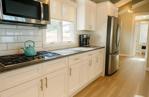 Fully equipped, stainless steel appliances, cooking basics & spices, drip coffee maker, toaster oven, blender, kitchen table seats 6, counter seating
