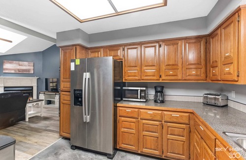 Living room: With a vaulted ceiling, skylights, and a smart TV, this is the perfect room for relaxing during your stay. If you're a biker, you'll enjoy the biker-themed decor and trails maps found in this room as well as others.
