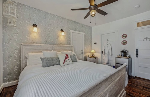 The Bird Nest room offers a luxurious hybrid king bed. Inside the private bathroom you will delight in soaking in our antique cast-iron tub with shower. Brew some coffee from the in-room Keurig, slip on a terry robe, and relax in a true haven of comfort.