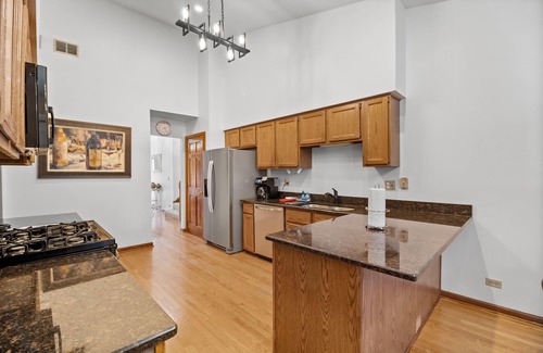 2300 SF unit is 10-12 min away from downtown Schaumburg, which is like a bustling mini Chicago, including plenty of bars/restaurants! This property has 5 bedrooms, 2.5 bathroom. Master suite has a KING, lower level has a King, 2 rooms with a Queen beds, and 1 room on lower level with 2 twin beds. The home has space for the 1 air mattress on-site. (Total of 7 beds). Plenty of Kitchen utensils, including cooking spices and oils! Children friendly & lots of technology!