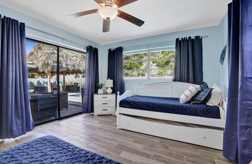 This sun-filled Pompano Beach Oasis with a salt water, heated pool is the perfect place to work, stretch, and play. The double master bedroom floorplan and wide open pool patio and Tiki Bar makes it easy for you and your guests to relax and enjoy
