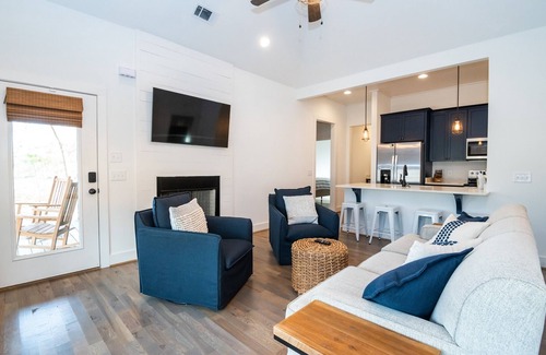 Blue Moon Over Lake Martin will be your favorite new escape at Lake Martin in the Village at Kowaliga Bay! It is well-appointed with thoughtful details and comfortable, relaxing furniture. This 3 bedroom, 2 bathroom cabin sleeps 8. Two bedrooms feature king-sized beds and one of these has an ensuite bath. The third bedroom has 2 sets of bunk beds. The huge, partially covered back deck has privacy and peaceful views as well as a Traeger grill for your enjoyment during your stay. You’ll find a well-appointed kitchen, indoor bar seating for eating, a Keurig coffee maker, and a large farmhouse table in the dining room.