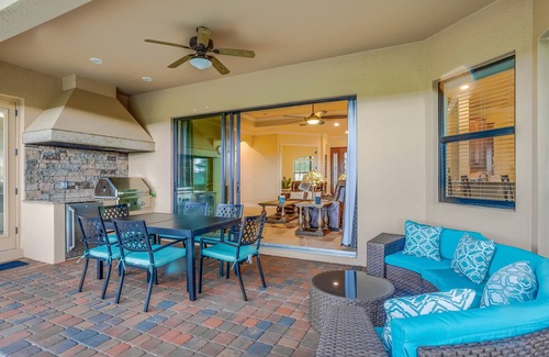 This sunny, single-level vacation rental features an open floor plan with a well-equipped, full kitchen with stainless steel appliances, counter seating, and a cozy breakfast nook. Enjoy more formal affairs in the adjacent dining area, or head outside, fire up the built-in gas grill, and dine alfresco on your covered patio. Back indoors, gather for movie nights in the living area with matching home theater-style seating and a TV. An in-home office offers a desk and chair and a quiet space for catching up on emails or addressing a little extra work while you're away.