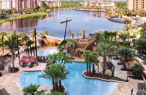 Closest to Disney Magic! But even with all the theme parks nearby, you'll be surprised by how much there is to enjoy right on site. 2 poolside water features including the "Pirate Ship", 5 outdoor pools, 9 hot tubs, 2 lazy rivers, miniature golf, volleyball, organized kids activities, three pool bars, and picnic/barbecue areas. After a busy day, come relax in a luxurious living area with a full kitchen, balcony/deck, a spacious bedroom and pull out couch. Enjoy extra convenience with Daily round-trip shuttles from the lobby to Walt Disney World resort !!