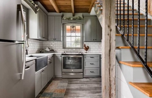 While away balmy evenings with barbecues on the deck at this rustic retreat with wooden beams, exposed stone walls, and elegant sash windows. Decompress with leisurely morning chats on the porch swing, then whip up a snack in the chic gray kitchen.