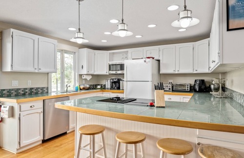 Inside, the entire space is bathed in natural light from the lake and hillside views beyond. Every bit of decor was procured to create that perfect blend of style and comfort. The open living, dining, and kitchen area is perfect for your family or small group to spend time together and sits just off the sunroom. The fully stocked kitchen is ready and waiting for your culinary creations. When it's time to rest, there are three bedrooms to recuperate in before another day of adventure on the lake or wherever your stay on the coast may take you.