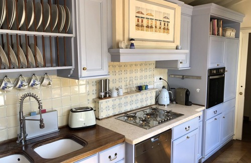 The kitchen is fully equipped and very bright, facing directly onto the spacious terrace which has a dining table and lounge area.