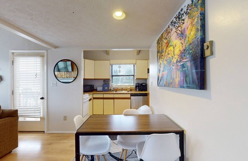 From the kitchen, another staircase leads you to the loft—a versatile space with a futon, ideal for additional guests or simply relaxing with a book. Essential amenities, including an in-unit washer and dryer, ensure a hassle-free stay, while playful touches like a nostalgic Pacman arcade machine add a bit of fun to your downtime.