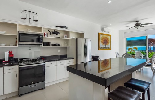 As soon as you enter this air-conditioned, single-level villa, you are greeted by a splendid open floor plan with tiled floors throughout. Spend tranquil evenings streaming entertaining shows and movies on the smart TV in the living room or lounging on your private patio with impressive views of the beach and ocean in the distance. Prepare culinary masterpieces in the well-equipped, island kitchen with stainless steel appliances and counter seating. An adjacent dining table also stands ready for meals or family game nights.