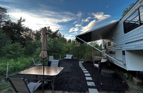 Newly remodeled camper nestled in a backyard, surrounded by lush greenery and wildlife.